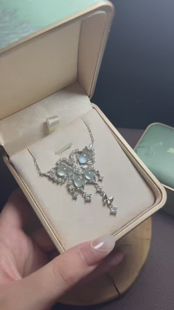 Crafted in a delicate butterfly silhouette, this piece features softly luminous jade stones framed by intricate silver-toned detailing, accented with shimmering crystals and subtle pearl touches. The gentle movement of the dangling elements adds life and light to every turn, making it a true statement necklace that feels both refined and expressive.