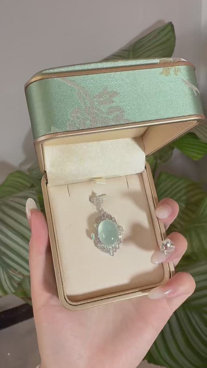 At the heart of this necklace rests a serene oval jade cabochon, smooth and translucent, symbolizing emotional balance and inner clarity. Surrounding it, precisely set baguette-cut stones descend in a vertical rhythm, evoking a cascading waterfall frozen in time. The silver-toned setting enhances the cool luminosity of the jade, while the elongated silhouette creates an elegant sense of movement and grace against the neckline.